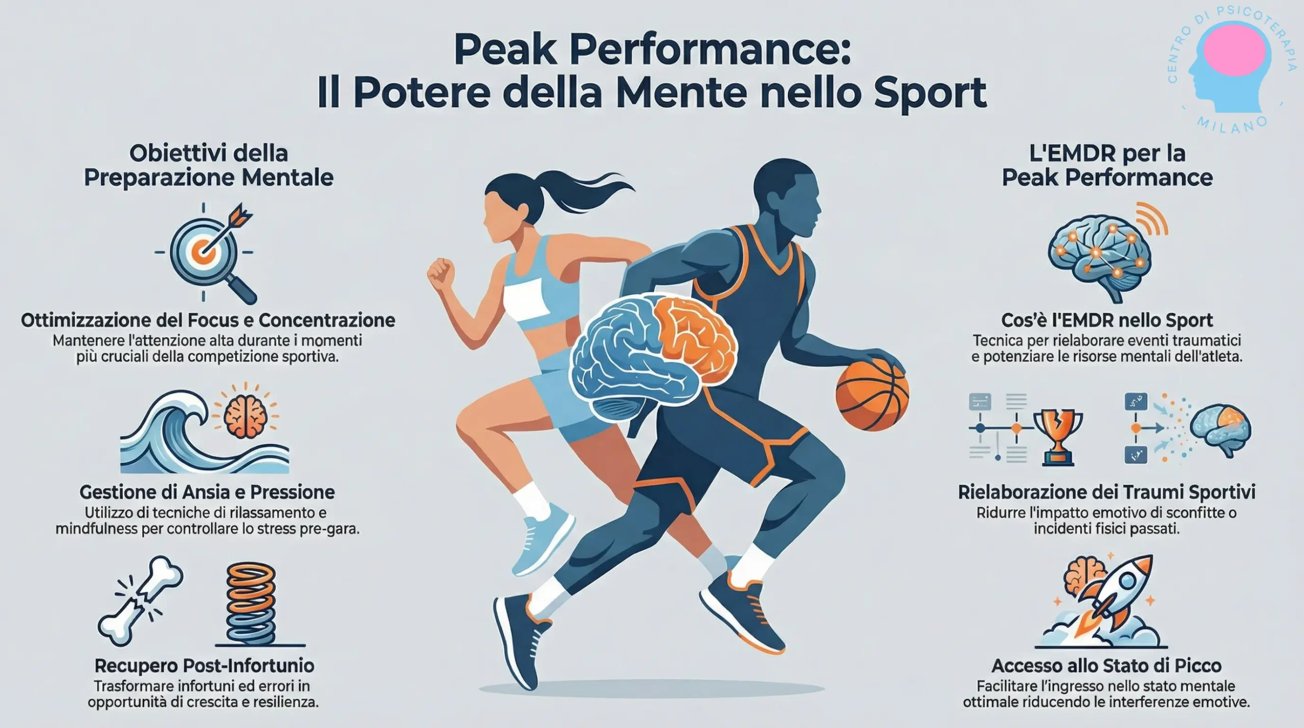 La psicologia dello sport aiuta gli atleti a migliorare concentrazione, gestione dell’ansia e fiducia in sé, favorendo il raggiungimento della peak performance e il superamento di blocchi mentali o esperienze negative, come infortuni, grazie alla preparazione mentale e all’EMDR.